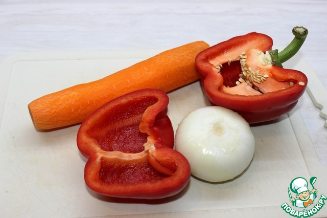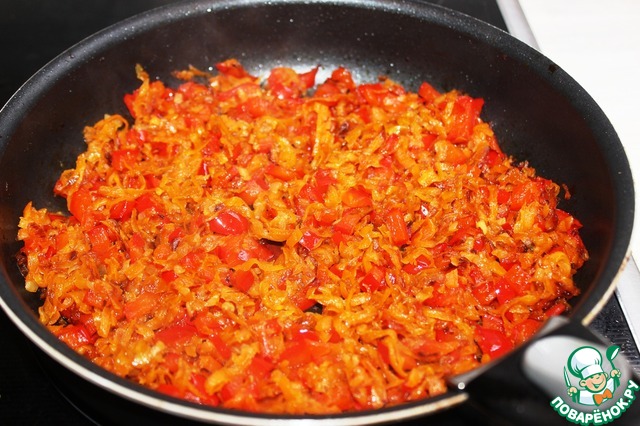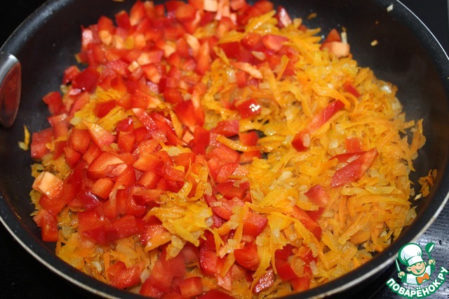 В сковороде, где жарились мясные шарики пассеровать лук, морковь, добавить нарезанный кубиком перец.