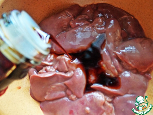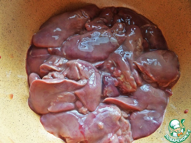 Печёнку обработать от жиринок, разделить крупные кусочки.