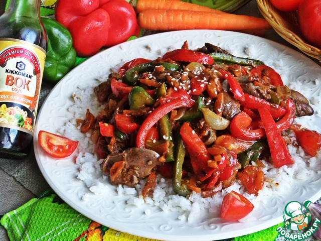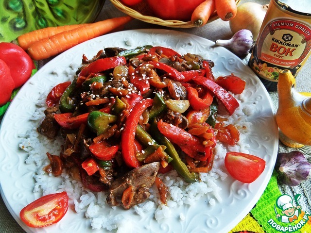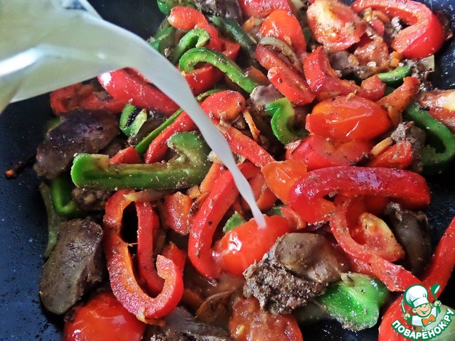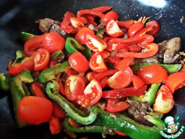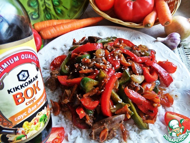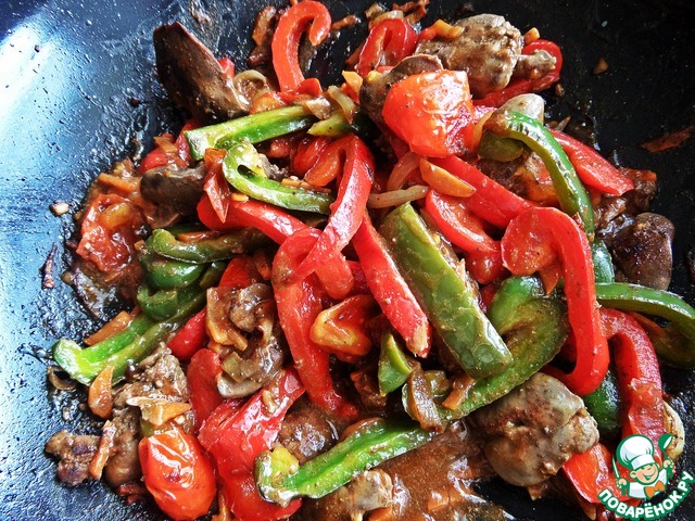 | Можно подать на горячее с гарниром или без в виде тёплого салата. Все знают, что печёнка, хоть и вкусна, но не привлекательна визуально. Но в данном варианте Ваш ужин будет ярким и манящим благодаря цветным овощам... и к тому же это очень вкусно! |