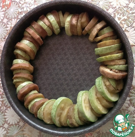 "Показать" сковороде. Буквально на полминуты укладываем на разогретую промасленную сковороду, слегка солим. Переворачиваем колечки, солим и через полминуты снимаем. Укладываем в форму "калачиком". Чередуя колечки баклажанов и кабачков. Соки от овощей выливаем в форму.