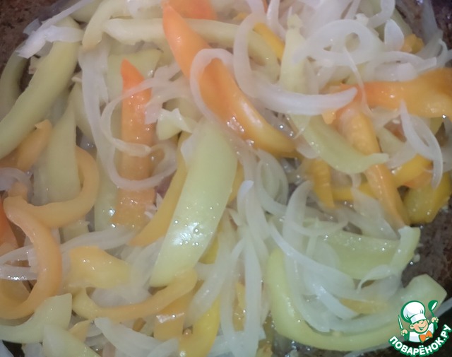 Лук и перец шинкуем "лентами", обжариваем.