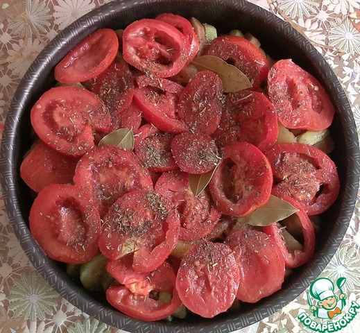 Помидоры нарезаем кольцами. Обжариваем с одной стороны 20 секунд. Аккуратно снимаем помидоры и закрываем ими форму с овощами (обжаренной стороной вниз). Солим, перчим, посыпаем приправами для овощей, "закапываем" в калач лавровый лист и черный перец горошком.