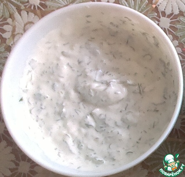 Стандартный сметанный соус с зеленью: мелко крошим зелень и чеснок.