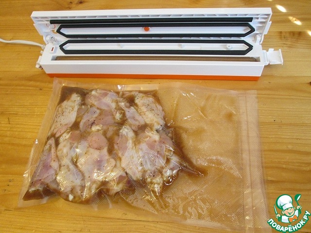 3 – Упаковать в вакуумный пакет, вместе с маринадом, на кануне вечером, положить в холодильник. Жарить через 24 часа. Это очень удобно, типа пришел вечером, достал сею «консерву», кинул на гриль и все готово.