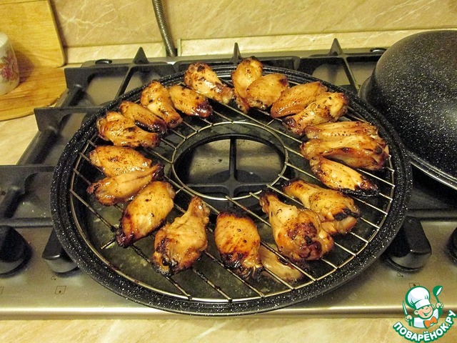 Накрываем крышкой и жарим минут 20, зависит от горелки. В процессе жарки пару раз перевернуть. При последнем переворачивании смазать крылья остатками маринада. Не отработанным маринадом, а оставленным на кануне.