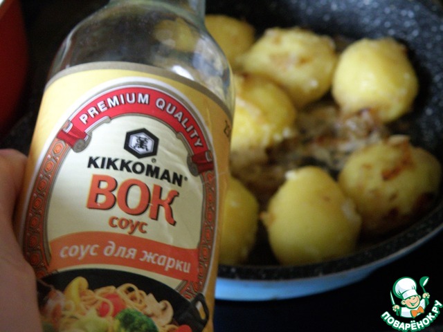 Полить картошку соевым соусом и жарить до его выпаривания. Лучше всего взять просто классический соус от «Киккоман». На готовую картошку выложить кусочек сливочного масла и накрыть крышкой.