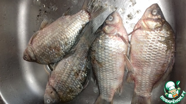 На фото я обдала карасей кипятком с обеих сторон. Это мой любимый способ для легкого очищения от чешуи, достаточно подхватить ее ножом от хвоста и вести к голове, это будет очень легко! У маленьких карасиков можно даже рукой снять.