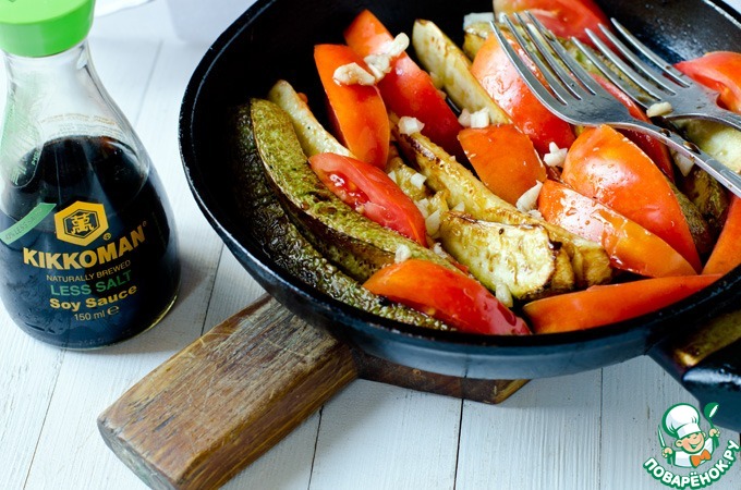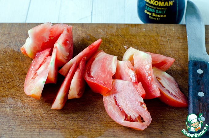 Затем добавить мелко порубленный чеснок, помидоры и соевый соус Kikkoman, поперчить, накрыть крышкой и тушить на слабом огне в течении 10 минут.