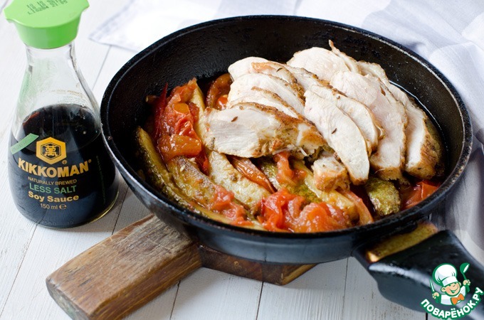 Куриную грудку нарезать порционными кусочками, добавить курицу к овощам и тушить еще 5 минут.