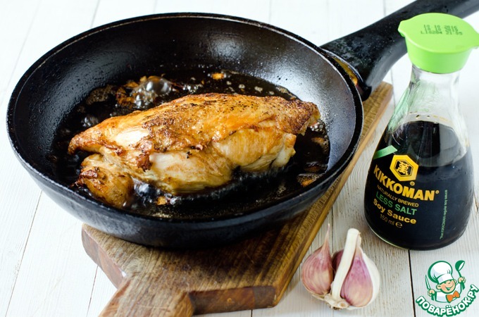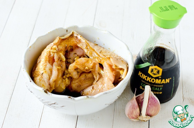 Куриную грудку натереть тмином, мелко нарубленным зубчиком чеснока, влить 2 ст. л. соевого соуса Kikkoman. Накрыть пищевой пленкой и оставить мариноваться на 15 минут.