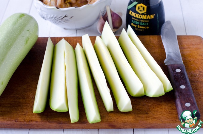 Тем временем кабачки необходимо вымыть, разрезать пополам и нарезать полосками.