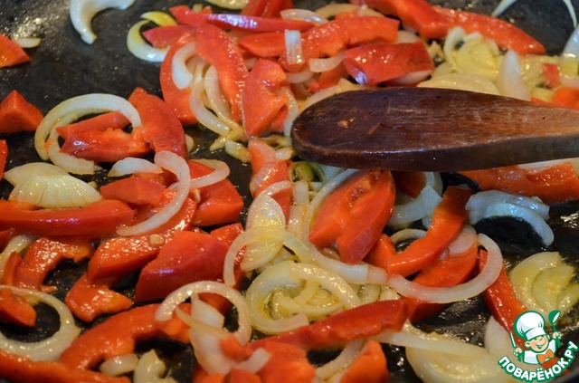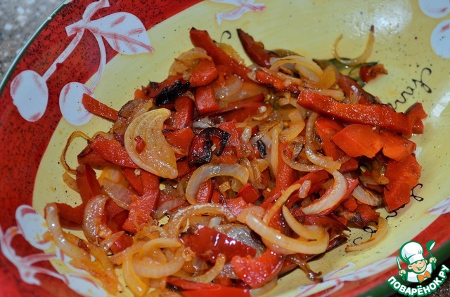 На 1 ст. л. растительного масла обжарить лук и перец,