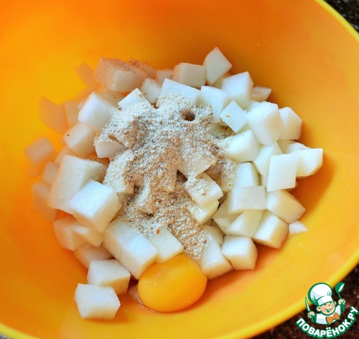 В кольраби добавить яйцо и панировочные сухари.