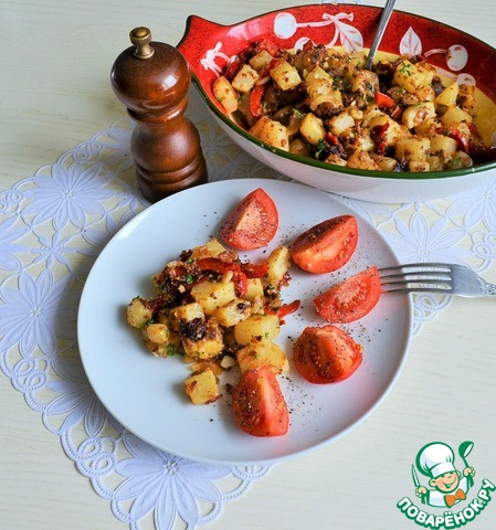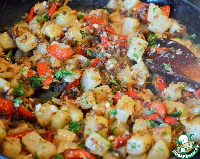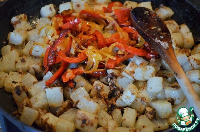 Выложить жареные лук и перец, перемешать,