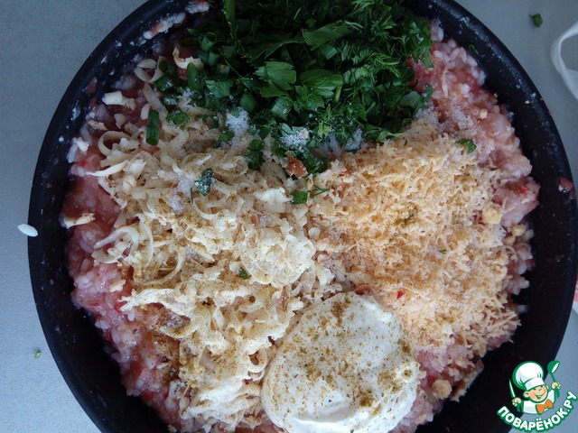 Добавляем сыр натертый на терке, рубленную зелень, сметану, соль и хмели-сунели (по желанию).