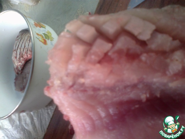 Далее по филе со стороны мякоти делаем надрезы до шкурки под углом 45 градусов в одну и другую сторону... и получаем так называемые кубики...