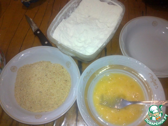 Поочередно окунаем филе = мука, взбитое яйцо, панировочные сухари.