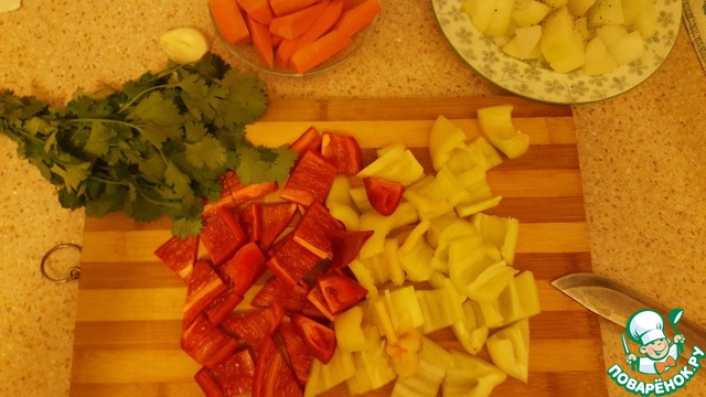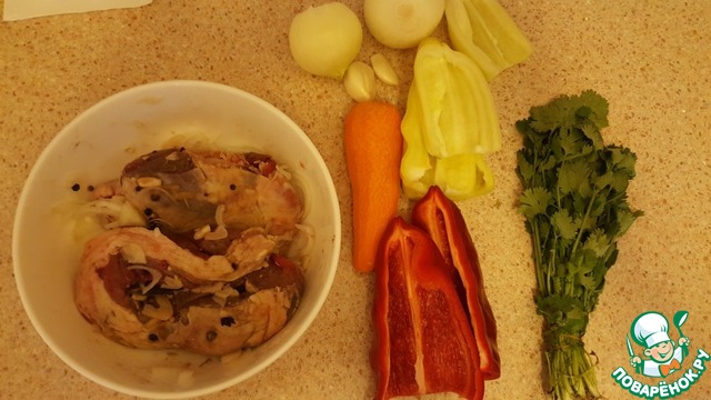 мясо баранины я замариновала заранее ( маринад соевый соус+сок лимона+перец горошек+лавровый лист+соль)