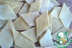 Можно тесто сделать самостоятельно, тонко раскатать, порезать ромбиками - сварить. Я купила готовые сочни.