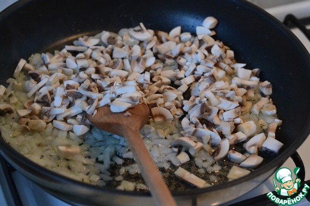 На сковороде растопить масло, добавить мелко нарезанный лук. Слегка обжарить и добавить нарезанные шампиньоны.