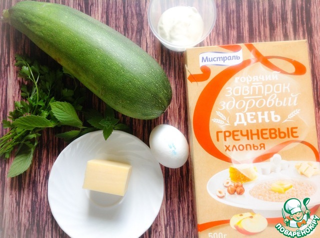 Кабачки хорошо отжать от влаги и добавить в миску. Туда же добавить гречневые хлопья и зелень.
