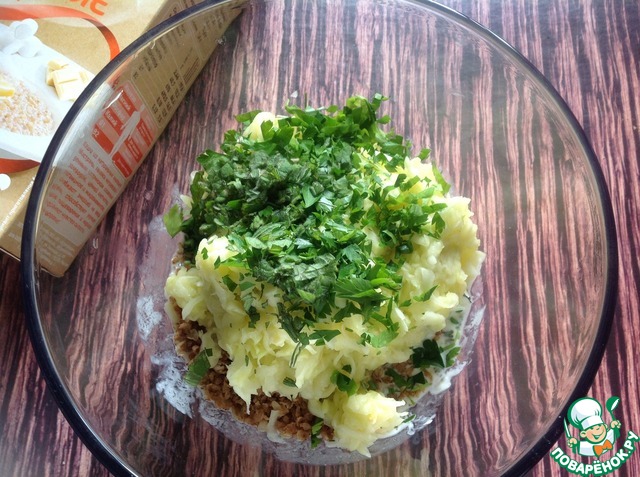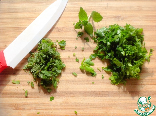 Зелень помыть, обсушить и нашинковать. Зелень можно использовать любую, какая по вкусу. У меня петрушка и мята.