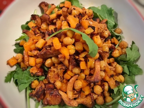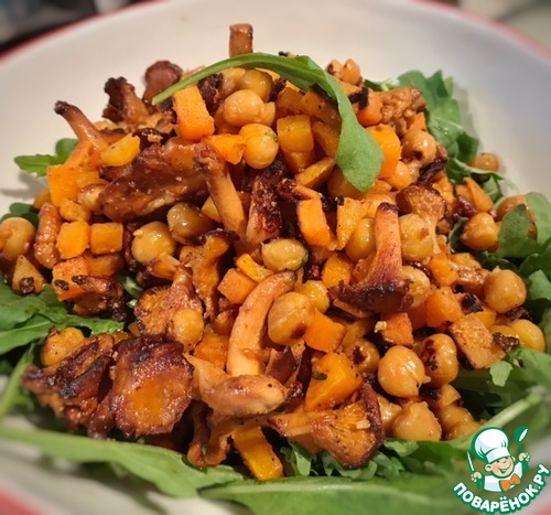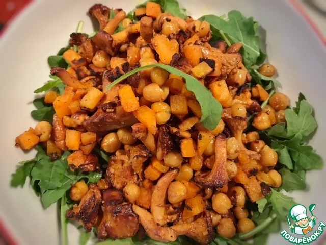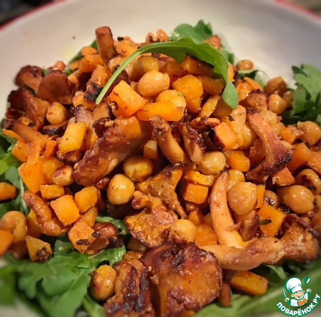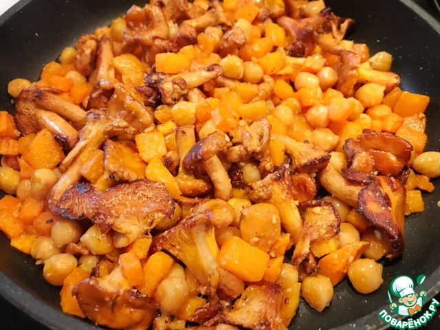 Немного посолите и когда лисички будут готовы, всыпьте в сковороду нут с бататом. Возможно ( по вкусу) можно будет добавить чуть больше соли и чесночного порошка.