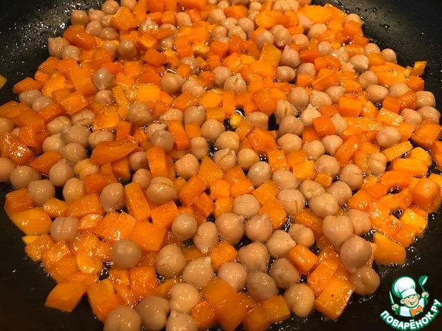 Добавьте нут к батату. Обжарьте все и добавьте куркуму и чесночный порошок. Посолите.