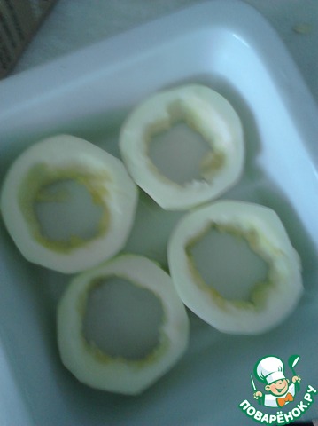 Цуккини очистить от кожуры, нарезать кружочками шириной 2,5-3 см. Вынуть мякоть с семенами. Полученные кабачковые кольца выложить в смазанную маслом в форму.