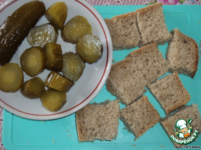 1.Хлеб нарезать на кусочки, огурцы - на кружочки.