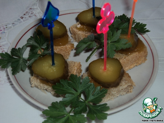 2.На кусочек хлеба намазать 0,5 чайной ложки мёда, сверху кладём кружочек огурца и втыкаем шпажку. Закуска готова.