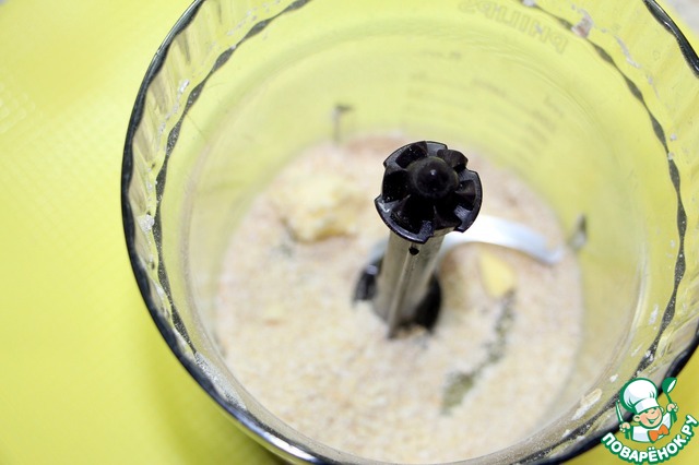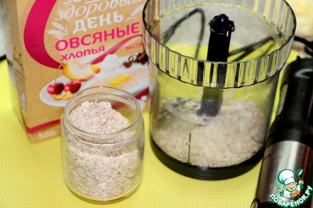 Овсяные хлопья (для штрейзеля и для соуса) перемолоть в блендере в муку. Получившуюся овсяную муку разделить на две части.