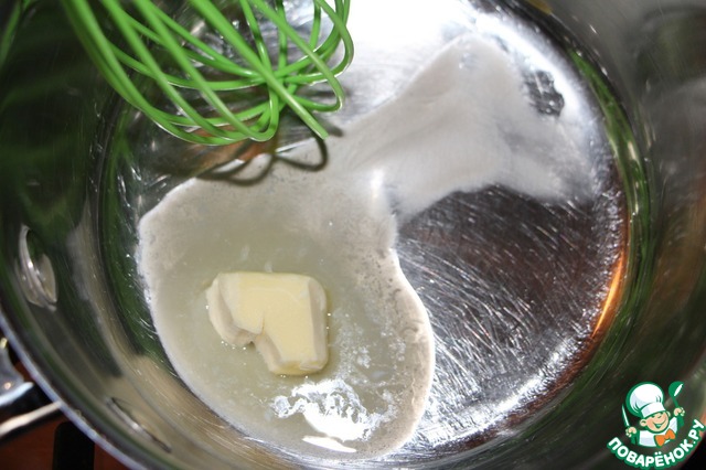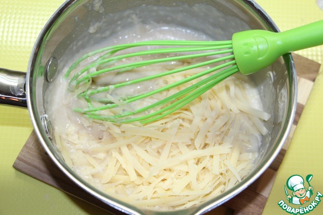 Влить молоко и куриный бульон, непрерывно помешивая дождаться загустения соуса (5-7 минут).