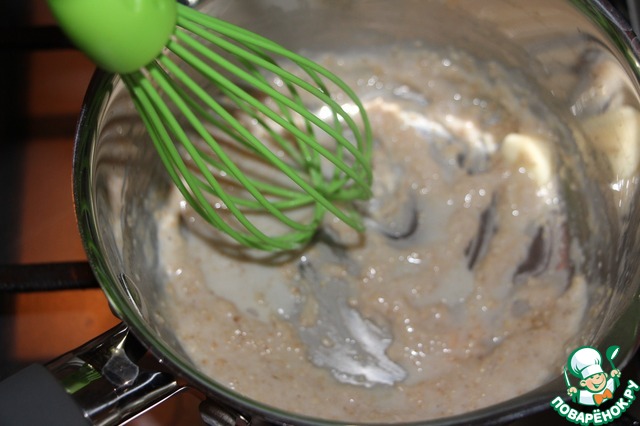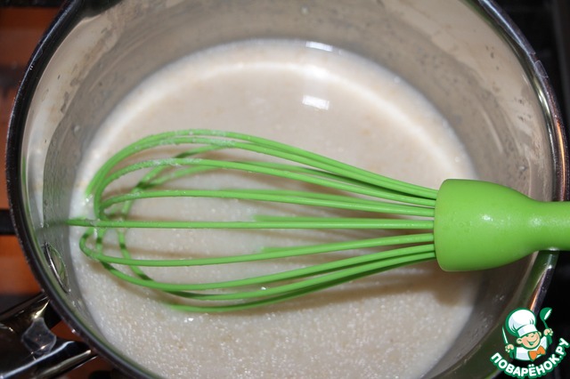 Всыпать оставшуюся овсяную муку, готовить непрерывно помешивая, чтобы не образовывались комочки.