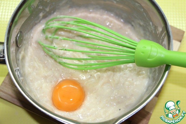 Добавить желток, приправить солью и молотым черным перцем. Перемешать.