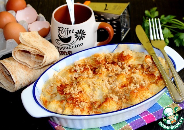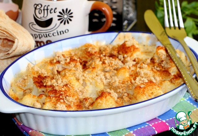 | Сытное, но в тоже время легкое блюдо, прекрасно подойдет для плотного завтрака. Нежнейшая цветная капуста в молочно-сырном соусе с хрустящими вкраплениями штрейзеля. |