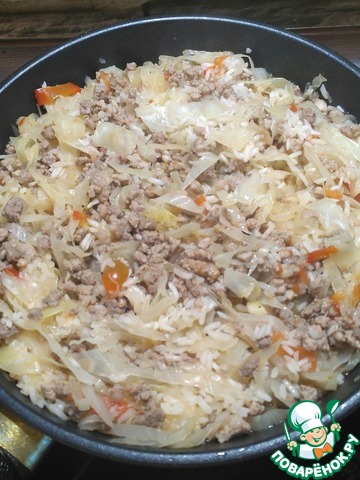 После этого фарш с луком солим, добавляем специи ( у меня перец, чеснок и приправа для мяса) и 200 мл воды. Далее выкладываем капусту. Сверху равномерно лопаткой раскладываем рис, ещё немного солим и заливаем ещё 200 мл воды. Не перемешиваем. Доводим до кипения и снова убавляем огонь. Тушим с закрытой крышкой 15 мин. Затем перемешиваем, добавляем кетчуп, рубленный чеснок и тушим примерно 10 мин до готовности риса и испарения всей воды.