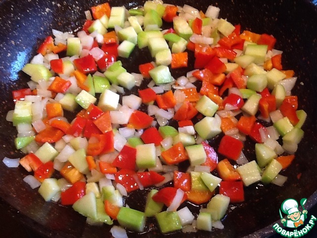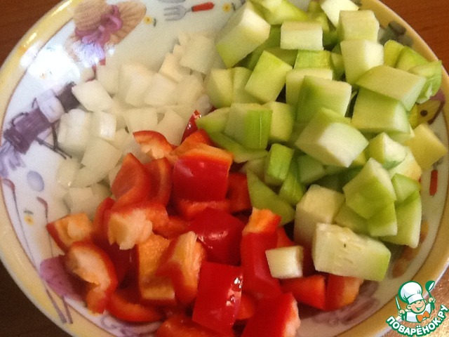 Порежем мелким кубиком репчатый лук, перец болгарский и кабачок.