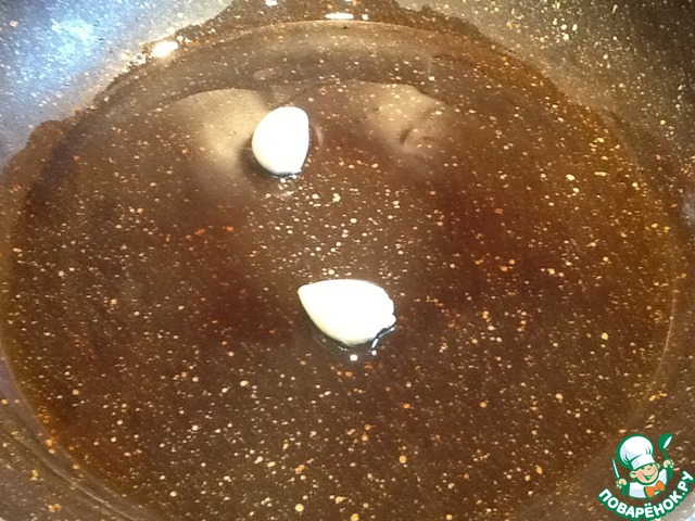 На разогретую сковороду нальем буквально по ложечке оливкового и подсолнечного масла. Положим 2 зубчика чеснока. Обжарим их до золотистого цвета и вынем. Они отдали свой аромат и больше не понадобятся.