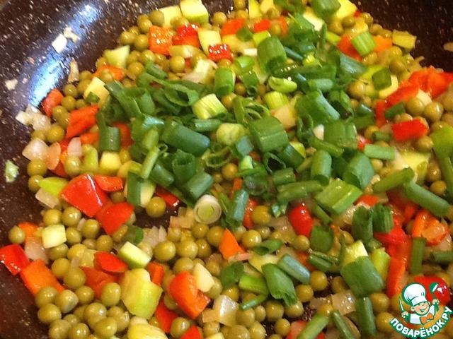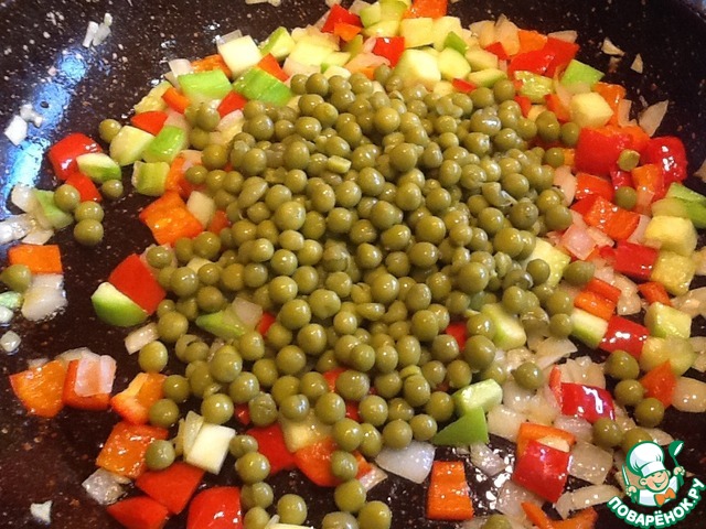 Сверху добавим зеленый горошек. Размешаем и обжарим 1 минутку.