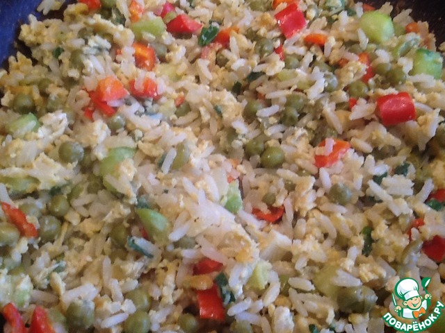 Выливаем к рису и овощам, перемешиваем, чтобы яйца распределились однородно.