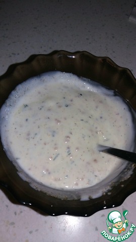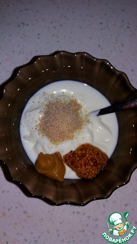 Пока нашу грудка запекается готовим соус. легкий и очень вкусный. Нам понадобится традиционный несладкий йогурт, 0,5 чайной ложки простой горчицы и 0,5 ч. л. зернистой горчицы. Сухая смесь для соуса "Дзадзики" во вкусу. Не смогла отметить её в ингредиентах.