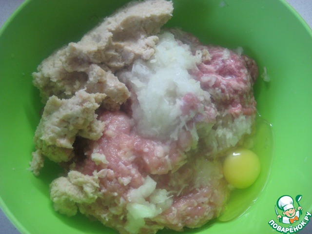 В миске соединить два вида фарша, яйцо, прокрученные через мясорубку размокший батон, репчатый лук и чеснок. Приправить солью и перцем по вкусу. Хорошо вымешать фарш, затем отбить.