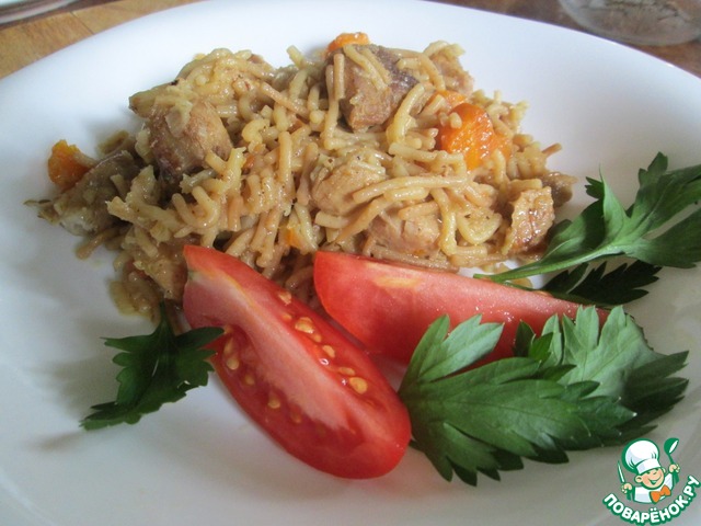 | В моей семье это блюдо называют "лапшичный плов". Готовится аналогично обычному, поэтому можете использовать свой любимый рецепт, только вместо риса берёте вермишель в той же пропорции. Для кого-то это блюдо не новое, а кто-то слышит впервые. Я многодетная мама, простота и время приготовления очень важны. Мультиварка-скороварка наша помощница. У меня старенькая и дешёвая Юнит, результат от этого не хуже. |