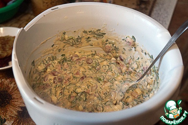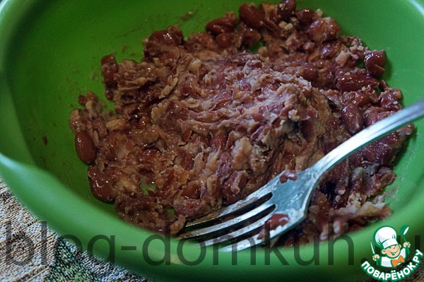 Приготовить начинку. Выложить в миску порезанные мелким кубиком ветчину и сыр, освобожденный от семян и перегородок и мелко порезанный перец чили, фасоль, мелко нарезанную петрушку. Все перемешать.