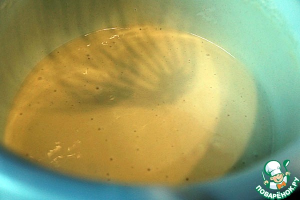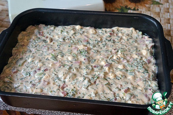В чаше комбайна смешать майонез, сметану, вбить яйца, добавить муку, разрыхлитель, соль и перец, замесить однородное жидкое тесто.