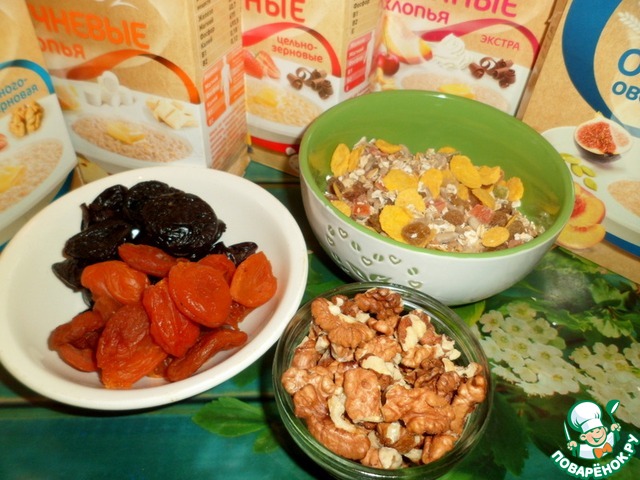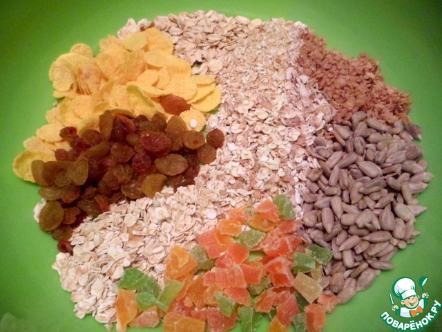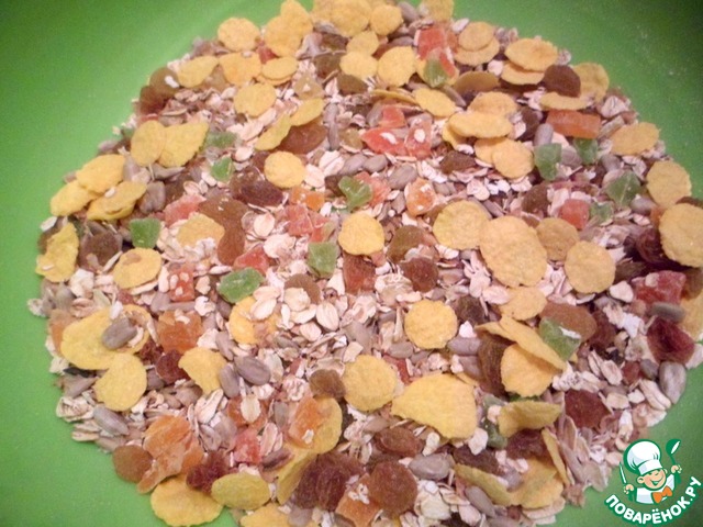 К ним добавить по столовой ложке дополнительных ингредиентов. Это на ваше усмотрение. У меня - изюм, семена подсолнечника, цукаты, кукурузные хлопья.