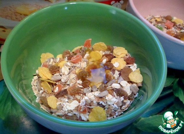 И так, разделить смесь на две мисочки, кто сколько съест, по возрасту детей. Добавить мед.