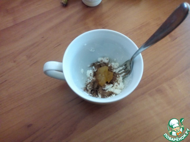 В кружку выкладываем фету и разминаем её вилкой, добавляем мёд и корицу. Соединяем.