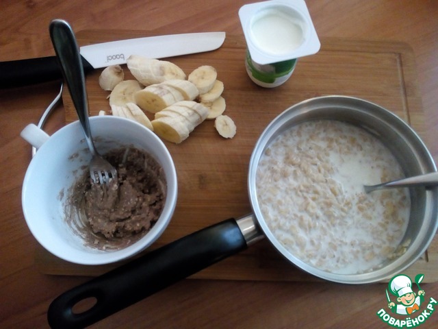 Каша сварилась и в неё сразу же выкладываем натуральный йогурт, перемешиваем. Выкладываем в кашу смесь из феты, мёда и корицы. Опять перемешиваем. Банан режем на кусочки. На 2 порции нам хватит одного банана или положите сколько вы любите.